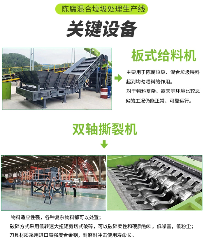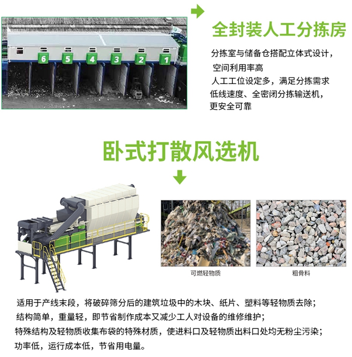設(shè)備配置:板式喂料(liào)機、階梯棒條篩、雙軸撕裂機、滾筒篩、臥式打散風(fēng)選機、人工分(fèn)揀倉、除鐵器、收塵器等