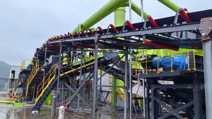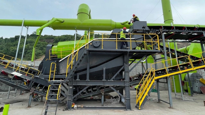 核心設備:鵝頸式輕型板喂機和中型板喂機(jī),全(quán)密封輸送帶,負壓臥式風選機、階梯棒條篩、人工+智能化機器人聯(lián)合分揀平台、雙軸撕裂機、除(chú)鐵器、除(chú)塵器等。
