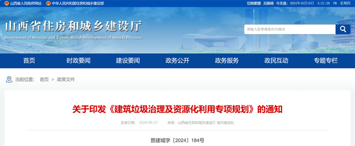 2024年9月15日,山西省住房和城鄉建設廳印發《建築垃圾治理及(jí)資源化利用(yòng)專項規劃》,加快完善建築垃(lā)圾源(yuán)頭減量、分類投放、中端收運、末端處置的(de)全過程監管體係,全麵提升全省(shěng)城市建(jiàn)築垃圾規範化管(guǎn)理和資源化利用水平。