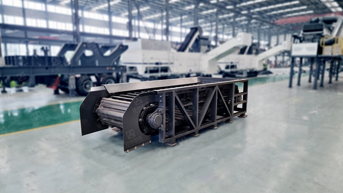 中型板式喂料機利用(yòng)固接在牽引鏈上的一係列鏈條提供牽引(yǐn)力,用金屬板作承載體(tǐ)引領物料隨著水平或者傾斜方向輸送(sòng)。為滿足垃圾篩(shāi)分生產現場的各種需求,我們可以對(duì)自動化線中的輸送機器進行具體設計。