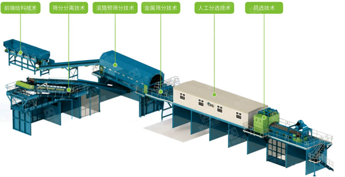 裝修裝潢垃圾處理係(xì)統采用“先分選後破碎,重分選而輕破碎”的工(gōng)藝理念,避免將(jiāng)雜物隨物料過度(dù)破碎反而增加分選的難度(dù)。