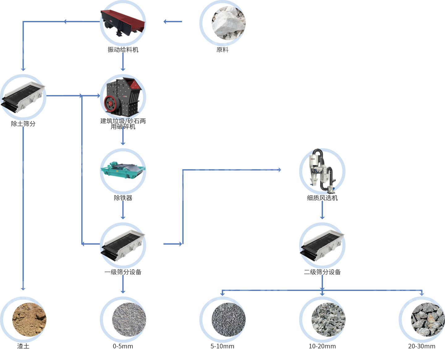 “二合一”生產線是什麽呢?該生(shēng)產(chǎn)線是指通過專用設備、合理的工藝布局,將(jiāng)建築垃圾、砂石骨料處理生產工藝合二為一,可根據砂石骨料的岩石特性及建築垃圾的不同構成進行靈活配置,專用設(shè)備合(hé)理搭配,輔助及工藝設備共用,處置產能不變,廠房占地麵積(jī)顯著縮減,投入成本大(dà)幅(fú)降(jiàng)低,大大提高設備運轉率,從而創造更大的(de)經濟(jì)效益。
